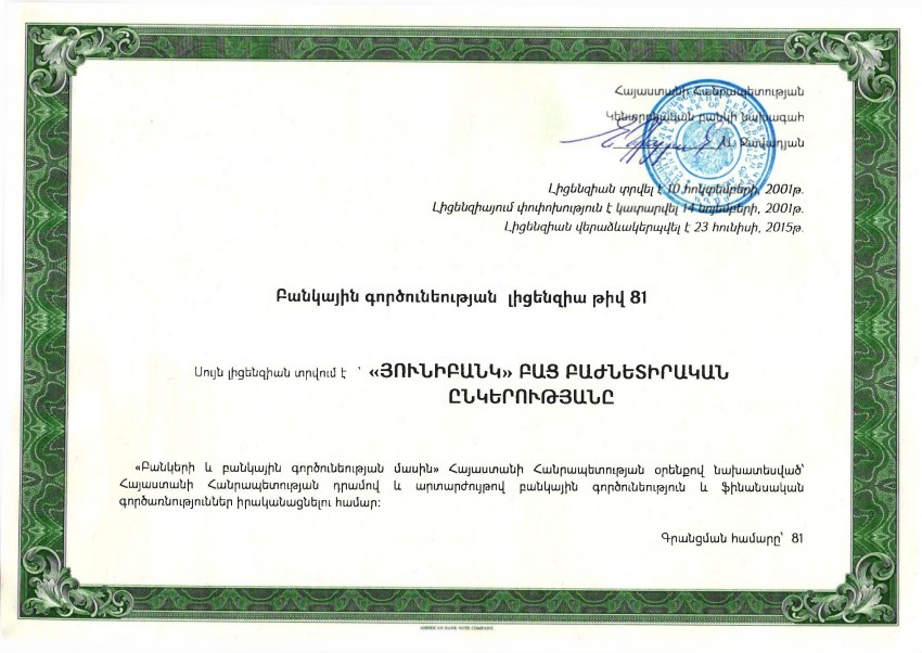 Банковская лицензия 81, выдана Центральным банком Армении 10.10.2001г., переоформлена 23.06.2015г. |